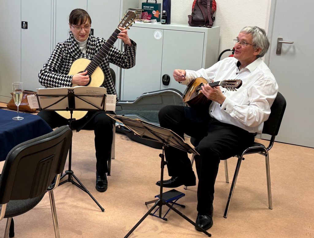 Nach Begrüßung zum Geburtstagsfrühstück und Begrüßungsumtrunk gaben Brigitte Neuenfels und Michael Piel vom Mandolinenorchester Hennef-Kurscheid 1924 e.V. ein Ständchen. Ausgewählt zum Anlass spielten sie ein Rondo von Raffaele Calace und das schwungvolle Stück „Ciel d’Italie“ von Louis Lunazzi. Das Mandolinenorchester gehört zum Vorstand des Trägervereins und hat seinen Probenraum seit Jahr und Tag in der Schule in Westerhausen.